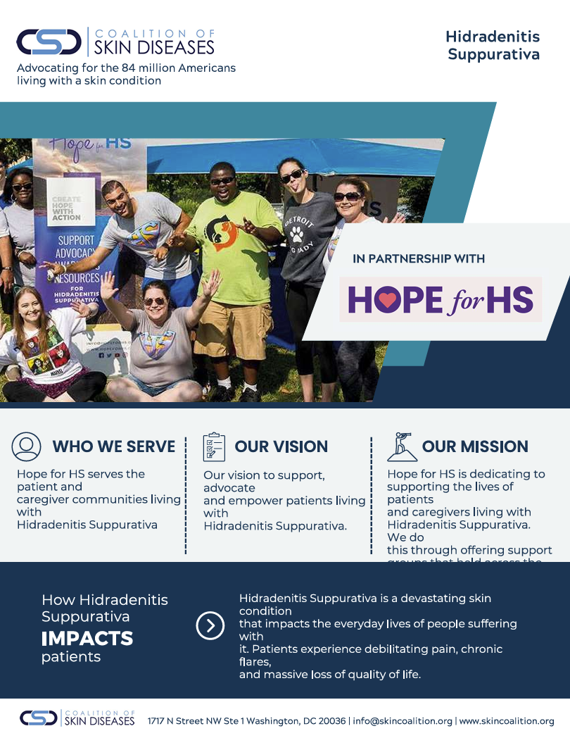Hope for HS is dedicating to supporting the lives of patients and caregivers living with Hidradenitis Suppurativa. We do this through offering support groups that held across the country, both virtually and in person. Our vision to support, advocate and empower patients living with Hidradenitis Suppurativa.